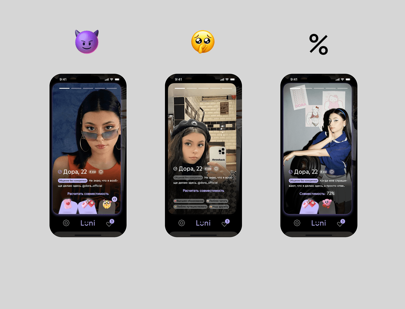 Luni: это дейтинг приложение с механикой расчета совместимости (Ai). Онбординг, CJM и основные страницы